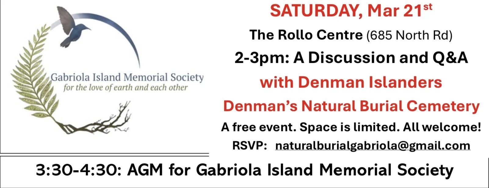 Volunteers from the Denman Island Natural Burial Cemetery will be joining us to share information and answer your questions about green burial and the establishment of their community non-profit cemetery. Following the Q&A and a break for tea and treats, GIMS will have our AGM.